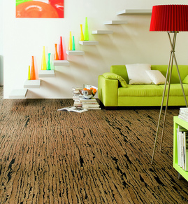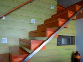 赤い踏み板だけの階段 この階段、手すりが壁側に...