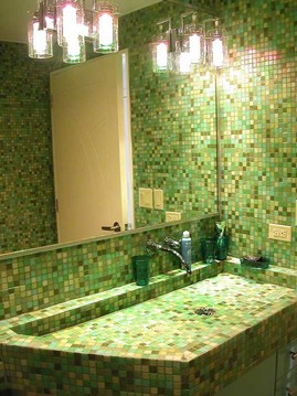 ライムグリーンのタイルの洗面所 洗面所の棚やシンクにも色...